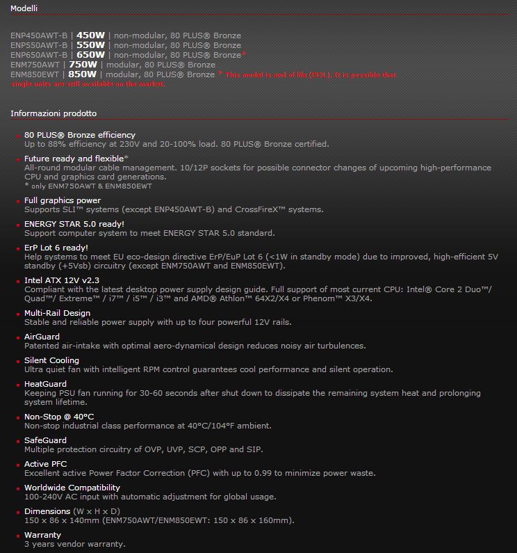 Non sono ancora disponibili informazioni dettagliate, se non che saranno presenti cavi interamente piatti, condensatori di qualità anche giapponesi, una certificazione di funzionamento fino a 40℃/104℉ per anni in utilizzo continuato, protezioni avanzate (OVP, SCP, OPP, DV UVP, SIP) e features avanzate come la "Cordguard" ovvero un sistema di blocco del connettore di alimentazione contro distacchi improvvisi. Oltre a questo ci sarà la certificazione ErP Lot 6 2013 per una massima efficienza del circuito dei 5V in stand-by, che porta ad un consumo molto ridotto, di 0.5W.