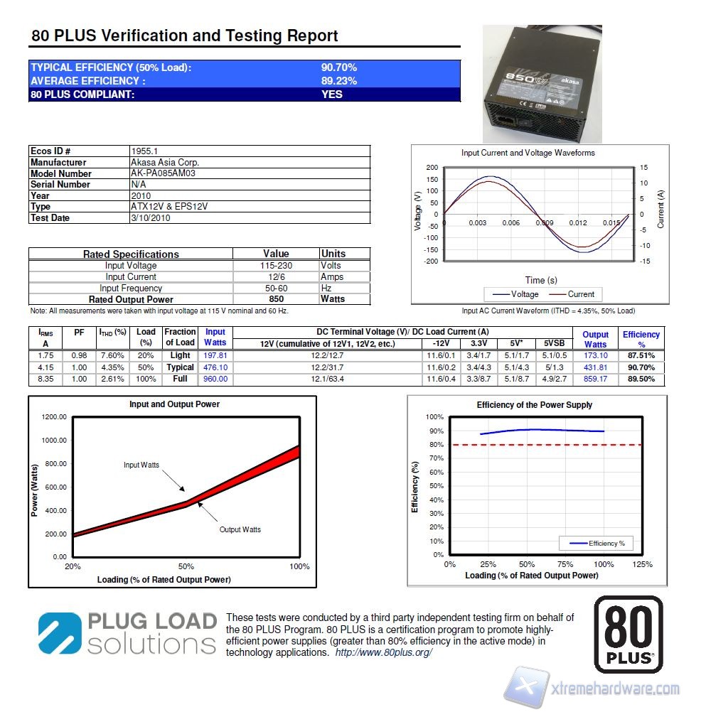 In questo capitolo prenderemo in esame alcuni dei fattori fondamentali per un alimentatore, l’efficienza e la stabilità sul canale dei 12V, quindi tutto ciò che riguarda la stabilità delle tensioni per la scheda madre, la CPU ed infine la scheda grafica. Al fine di darvi un giudizio complessivo migliore, anche riguardo l’efficienza dell’unità, vi riportiamo anche il test effettuato dall’azienda Plug Load Solutions, test che ne ha permesso la certificazione 80 plus presso l’organizzazione 80plus.org, ente che certifica tutti gli alimentatori immessi nel mercato.