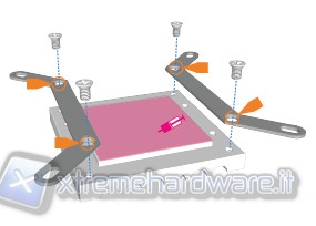Come già visto nella precedente pagina, il CPU Cooler si compone di 3 parti; per assicurare che il calore venga trasferito nella maniera più efficiente possibile è necessario che in alcune parti del sistema Heatsink venga applicata della pasta termoconduttiva, come da figura. Questa operazione va fatta poco prima dell'installazione. Successivamente andremo ad avvitare nella base del CPU Cooler i due bracket di ritenzione avvitando le 4 viti. Alla base che andrà a poggiare nell'IHS della CPU dovrà essere applicata della pasta termoconduttiva stendendola accuratamente.