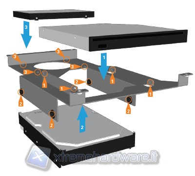 Non ci resta altro che installare le unità HDD e ODD nell'apposita slitta che avevamo estratto dallo chassis. L'unità ottica Slot-in va inserita avvitando le 4 viti (2 per lato), è possibile intervenire aggiustando il posizionamento delle viti a seconda del tipo di unità installata. Nella parte inferiore è possibile installare un'unità da 3.5", mentre nella parte superiore dietro l'unità ODD è possibile installare un'ulteriore unità da 2.5". L'HDD da 3.5" va inserita sotto l'unità ottica ed è sufficiente avvitare le 4 viti negli appositi gommini antivibrazioni. L'unità HDD da 2.5" va avvitata usando le altre 4 viti come da figura. Successivamente possiamo inserire la slitta ODD/HDD dentro lo chassis facendo corrispondere il pulsante Eject nell'apposito foro. Successivamente avvitiamo le 4 viti negli appositi fori in modo che la gabbia ODD/HDD sia perfettamente installata.