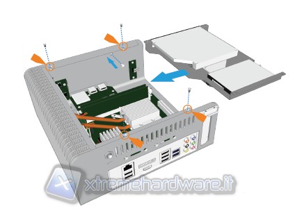 Per accedere all'interno dello chassis è necessario togliere il coperchio superiore. E' sufficiente rimuovere 4 viti, 2 poste sul fondo ed altre 2 poste sulla fiancata destra dove è presente il sistema Heatsink lamellare. In questo modo si può togliere con facilità il coperchio superiore, il quale fa corpo unico con la fiancata sinistra. Successivamente procederemo a sfilare dall'interno il rack porta HDD/ODD, in questo caso occore svitare le 4 viti che sono presenti nella parte superiore e sfilare la HDD/ODD cage dal suo alloggio.