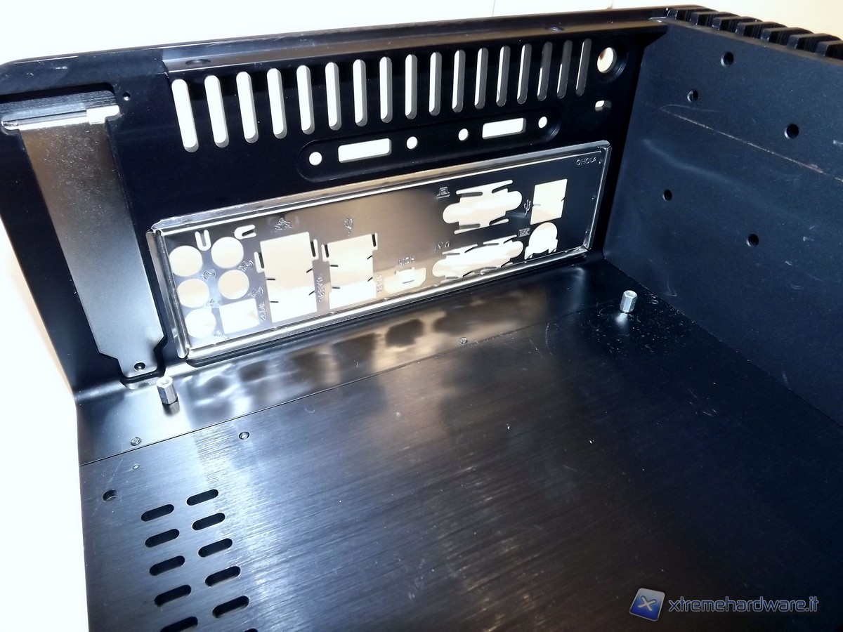 La fase successiva consiste nel rimuovere il sistema di dissipazione interno per la CPU. Procediamo a svitare le 8 viti presenti nella parete laterale destra. Le viti vanno rimosse dal lato esterno e sono accesibili tra le alette del fitto sistema Heatsink. Successivamente possiamo installare la mascherina di I/O all'interno dello chassis assicurandoci che entri bene nell'apposito alloggiamento.