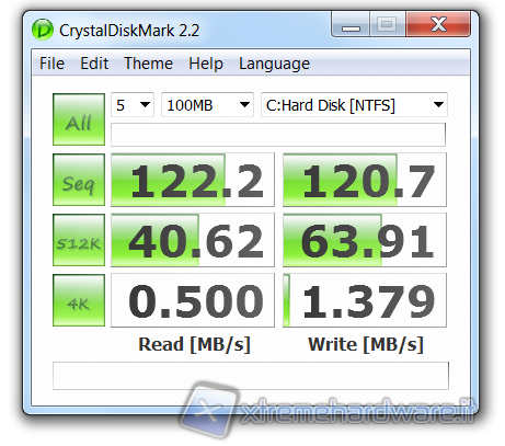 CrystalDiskMark è un utilissimo software per misurare le performance in lettura e in scrittura in modo sequenziale (sequential) e casuale (random), grazie al pieno supporto del NCQ (Native Command Queuing) l'ordine degli IOPS viene ottimizzato in modo da migliorare le prestazioni di input/output con una Queue Depth (file in coda) di 32, tale test consente di osservare il comportamento del drive durante il trasferimento di numerosi file con dimensioni ridotte.