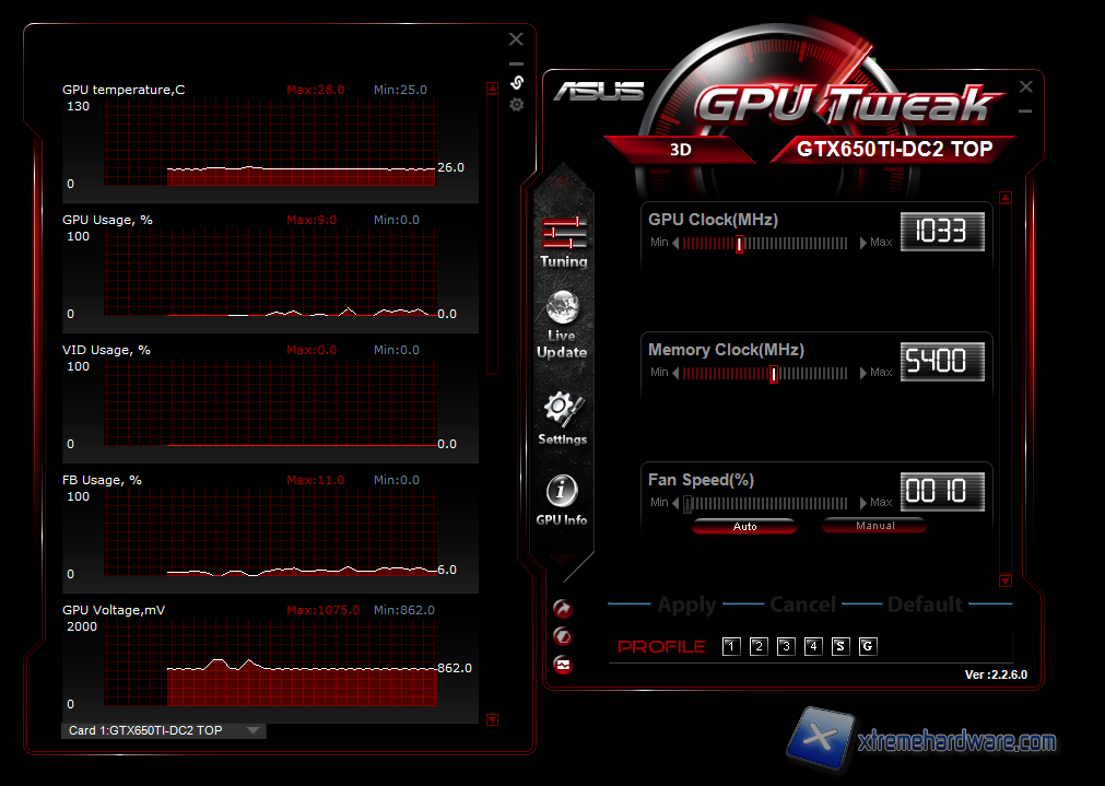 Attivando l'apposita funzione dalle impostazioni è possibile settare anche il GPU Voltage oltre agli altri parametri di tuning, nel nostro caso il vGPU è impostato a 1.075V. Utilizzando questo software abbiamo eseguito varie prove sulla GTX 650Ti di Asus decidendo di procedere nel seguente modo. Abbiamo impostate il vGPU al massimo consentito dal tool di ASUS e successivamente aumentato il regime di rotazione delle ventole oltre la soglia del 50%. Successivamente abbiamo testato la stabilità della scheda procedendo per gradi, fino a trovare la stabilità sia per il core grafico sia per le memorie. ll risultato è stato il seguente: